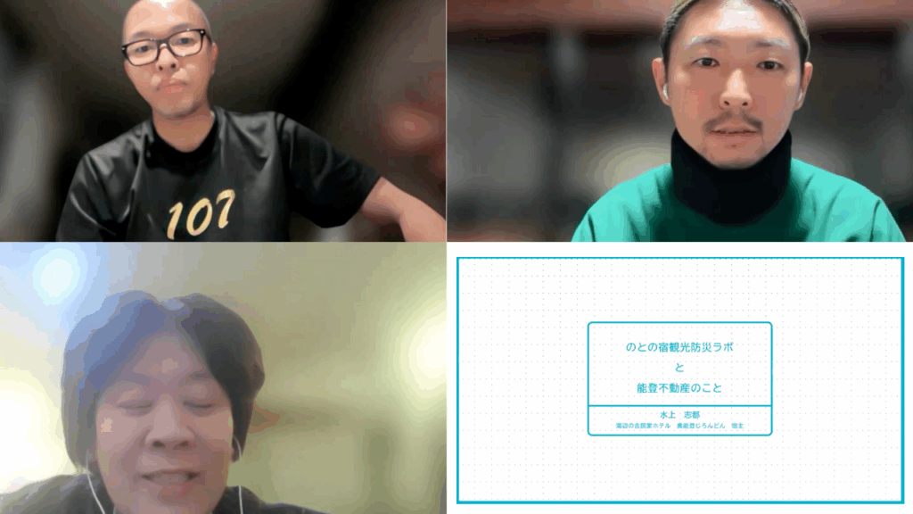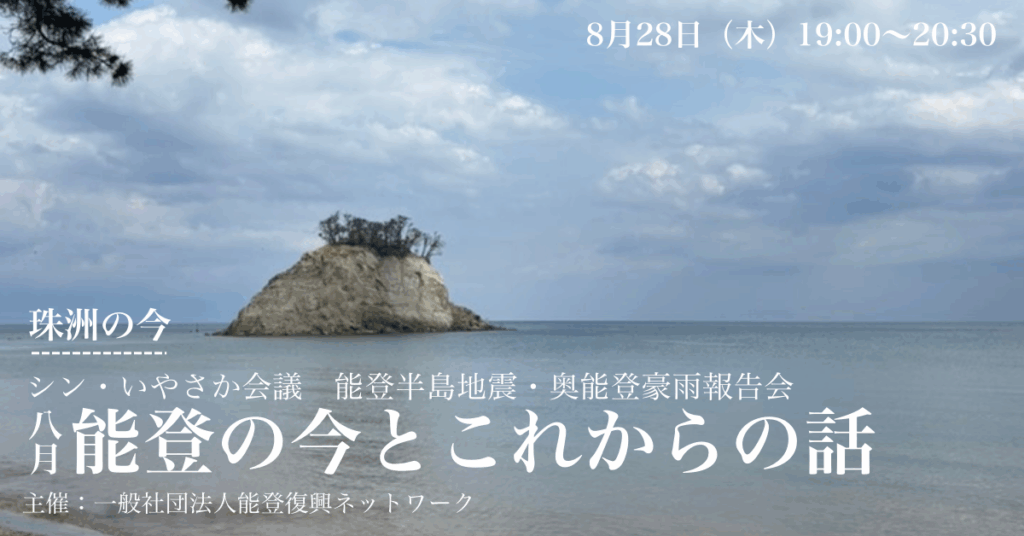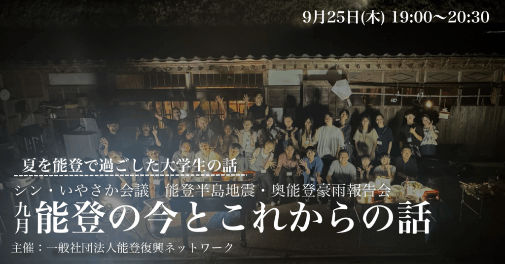 能登の今とこれからの話を伝える月例の報告会『シン・いやさか会議』を実施しています。能登で生き、活動している人の生の声を届け、支援したい人が情報を得ることができる場として、そして中の人が外からの支援を受け取ることができる場として運営しています。